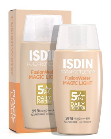 ضدآفتاب فیوژن واتر مجیک رنگ لایت ایزدین حجم 50 میل با اس پی اف 50 یک ضد آفتاب رنگی سبک برای صورت است. فرمول فوق سبک از پوست در برابر اشعه های UVB و UVA (SPF 50) محافظت می کند. پوشش طبیعی ایجاد می کند و عیوب پوستی را پنهان می کند و رنگ پوست را یکدست می کند. و همچنین چشم را تحریک نمی کند.این ضد آفتاب با ترکیبات جادویی خود، پوست شما را آبرسانی کرده و از آسیبهای ناشی از رادیکالهای آزاد محافظت میکند. با ضد آفتاب مجیک فیوژن واتر لایت، پوستی درخشان، سالم و جوان را تجربه کنید.ضد آفتاب مجیک فیوژن واتر لایت، مناسب انواع پوست، حتی پوستهای حساس است و به راحتی با آرایش ترکیب میشود.جلوه این ضد آفتاب پس از استفاده مات است و قادر است ظاهری یکدست و ابریشمی به پوست شما ببخشد. کرم ضدآفتاب فیوژن واتر مجیک رنگ لایت باعث تحریک و سوزش چشم ها نشده و می توان آن را در ناحیه ی اطراف چشم نیز استفاده کرد.